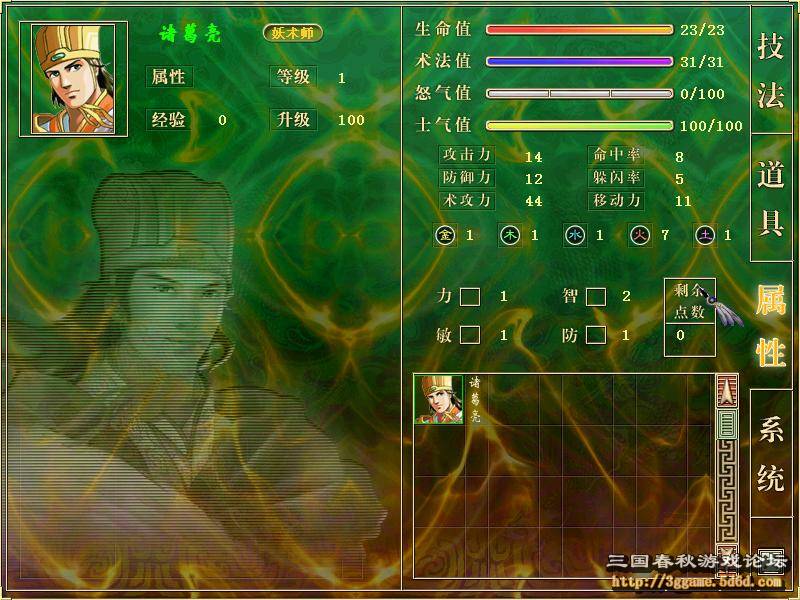 老人总是怀旧的,这一日,水镜先生把弟子叫来,又一次诉说着自己成名的经历(整整一个时辰啊,古人真是好闲……)。说完以后,水镜先生表示,诸葛亮和司马懿都已经拥有了足够的能力在凡世建功立业了。不过按照水镜山庄的规矩,要下山就必须先闯春秋大阵。(输了也没有关系,游戏继续进行。如果不是为了这些宝物的话,完全可以让诸葛亮一个人上。在春秋大阵里,不需要可以培养和平衡人物的等级,因为下场战斗开始时的人物等级都是系统默认的。)