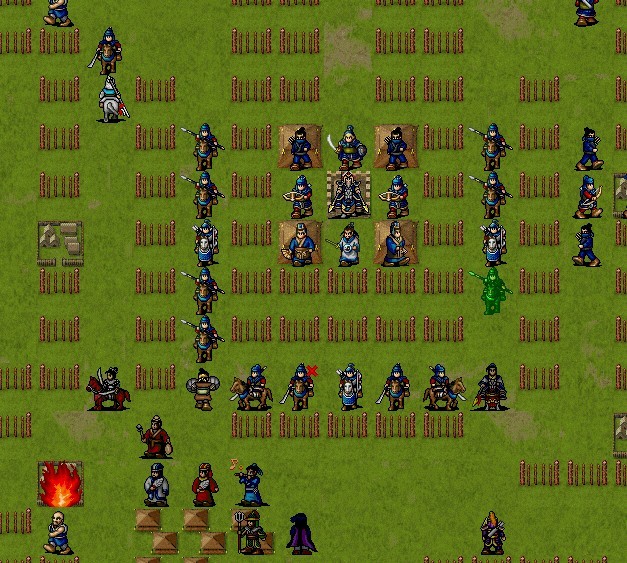 中间那群兵不用管,只要有一个人堵住王君珂那个点,另一个人堵住王伯当右边两格那个点就行了。最好给王伯当加个强行,这样一次就能移到王伯当的右边两格那个点,上面的那个重骑就不会堵路了。