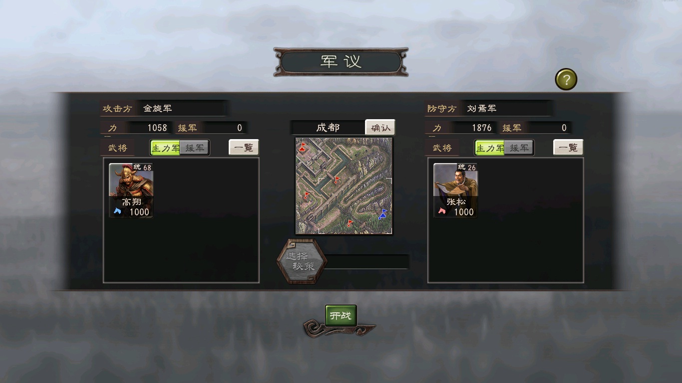 战斗开始:高翔1000骑兵,大本58;对面张松也是1000骑兵,大本857。成都两个城门各800防,还有个关隘1200防,看着有点傻眼,2800的城防砍得动吗?