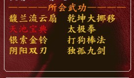 这是我目前学的武功,目前阴阳双刃2级 独孤6级,其他的都是10级,还有两个位置打算十八掌 和九阳,这样除了刀法160+其他都可以满了,没学四象,五目打六大世外高手也没危险,但六目目前出现这个问题玩不下去了。