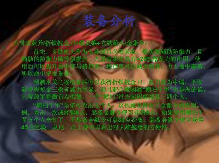 首先,玄铁枪头作为专业道具必须装备。煅炎锦辅助防御力,且辅助的防御力随等级提升。八卦宣花斧具有+25%爆发力的作用,使用后可以提升命中率与格挡率。格挡率可以减少伤害,力士命中麻痹,所以命中率很重要。