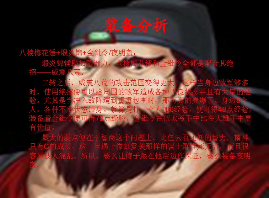 “踏破联营”可以直冲到敌人阵中,身陷重围作战。如果不穿雁翎锁子甲一会就会被弓箭射死。因为身边敌人众多,所以装备轩辕神枪可以加防御降低伤害。在使用绝招的同时+防御+爆发+移动。加爆发还可以提高格挡降低伤害。而使用夜明盔则主要是应为伍侯爷智力太低容易中计,从而导致各种不良状态缠身,进而导致陷入敌阵无法再战。这样装备夜明盔下回合便可以恢复状态继续作战。如果拖级成功的话便可以继续使用绝招,这样便可以像一辆轻坦克一样穿梭于敌阵之中。