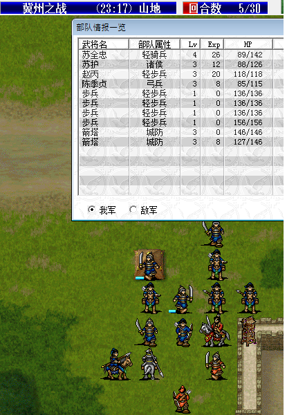 苏护后退,全忠占兵营,敌军回合梅武会来攻击全忠,单挑挑掉他升到4级,也可能的格檔一下攻击(格檔不了也无伤大雅)