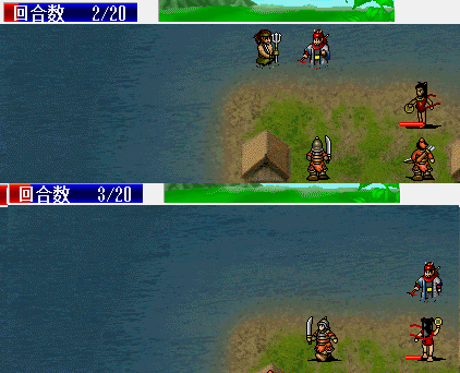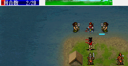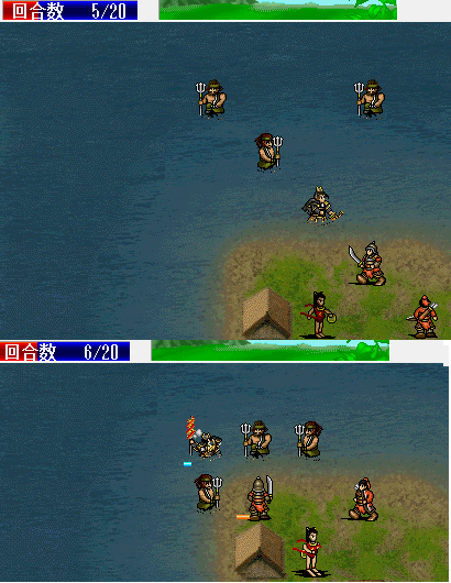 石怪石矶到达中心岛,石矶会繞到哪吒的前方兩格攻击,哪吒反击不到石矶,李靖記住加血,哪吒代師傅火燒石矶
