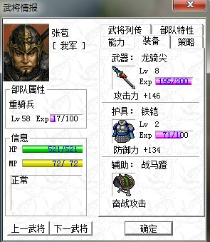 朋友们,刚刚玩到街亭之战。从一开始就没准备救马超,因为我觉得兀突骨、张苞一样可以培养以来,虽然张苞需要比较多的统帅果,可我还是觉得只要培养,张苞能力还是赶上马超的,而且多了一个不怕弓箭和投石车的骨头,S的防御,肉盾又多一个,可谓骨头一出,一阵叮叮当当,谁与争锋。另外,我还全力培养了吴班,S攻击,A+敏捷,回回双击,B+防御低点,不过也不错了,可以靠豪龙胆和格斗衣提高爆发,往树林里一趴,120%地形能力,生存能力大大提高,因为其士气超低,配上双眼虎,别看敌军回回暴击,打在吴班身上,铛铛作响,滴血不掉,那叫一个爽歪歪呀,如果配上青龙偃月刀,我气死你。看看我的人物培养吧,张苞是12级吃满果的,马超一死,立马上位,吴班也是12级吃满果的,好像是收姜维那关出场的,兀突骨38级吃满果。