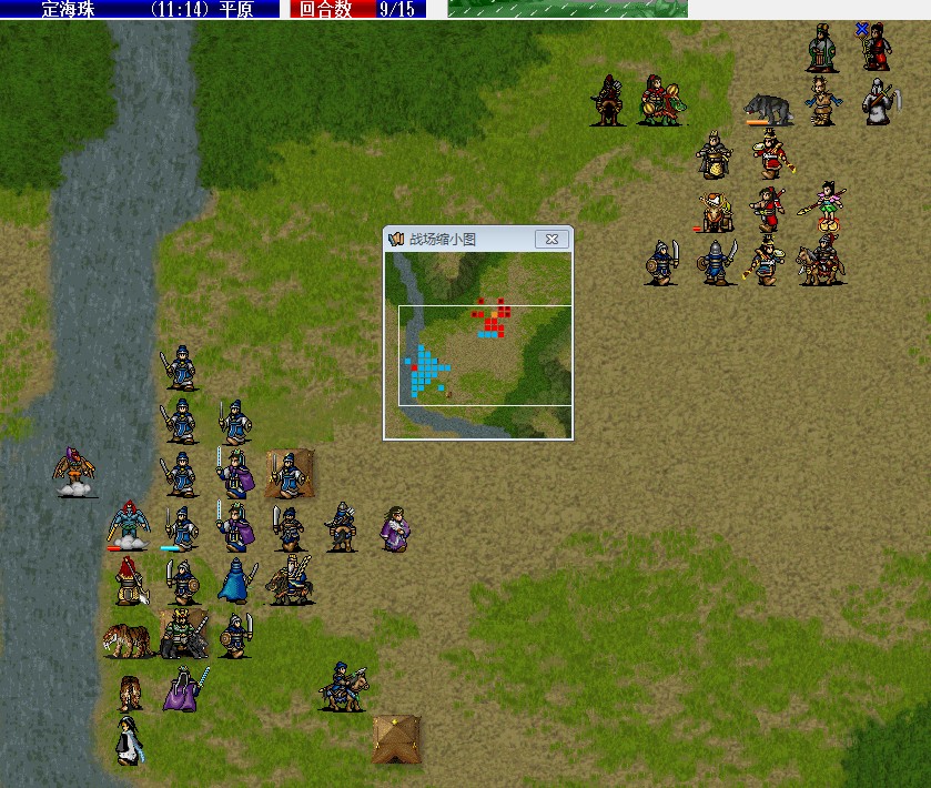 容易观察到,敌方大部分道士都在左边,因此,用雷震子飞到小河上,可以有效吸引道士的火力。而这些道士的法术命中几乎都不超过20%(雷震子75%策略防御),稍微SL一下就能全部miss。而其他的近战由于打不到雷震子只能退而求其次地去打右上方的我军大部队,于是近战和法师就脱节了。