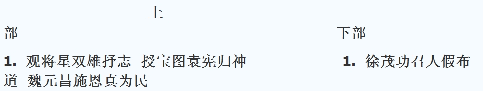 1. 观将星双雄抒志 授宝图袁宪归神 1. 徐茂功召人假布道 魏元昌施恩真为民