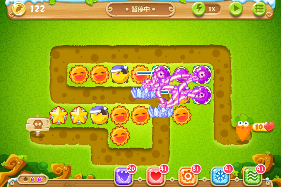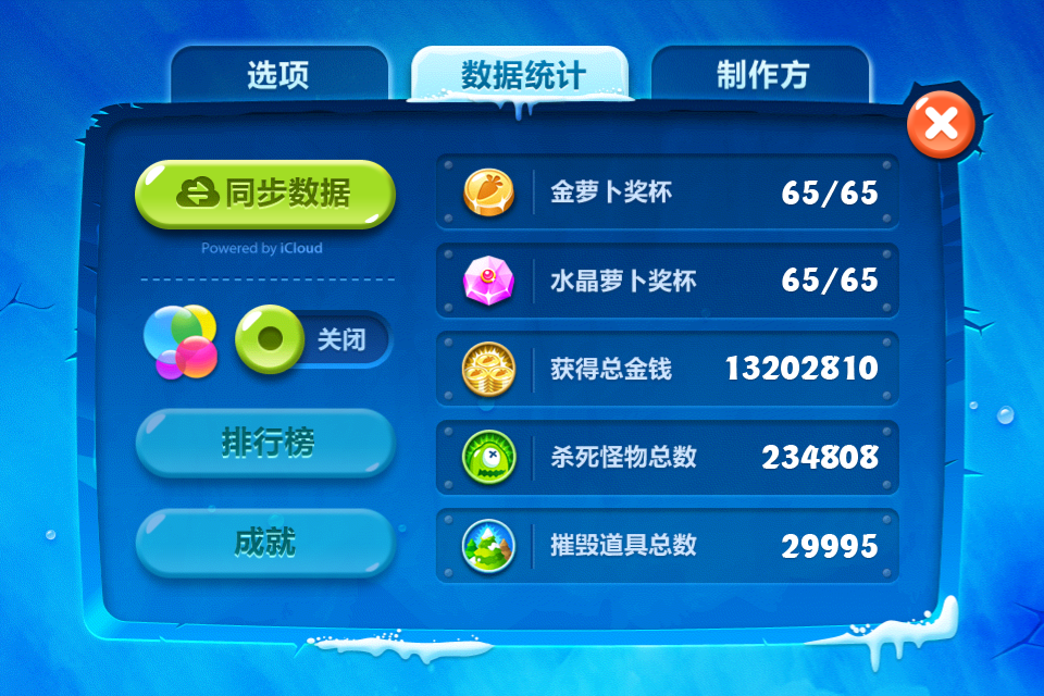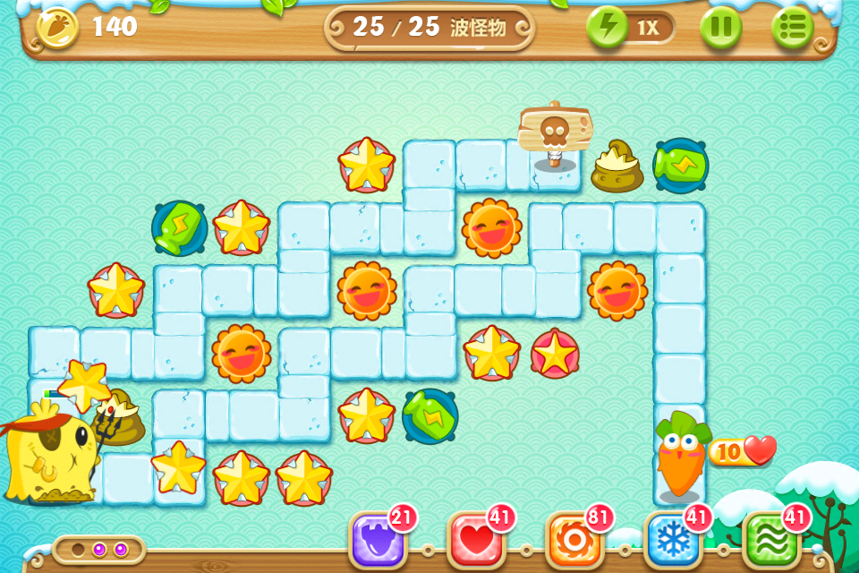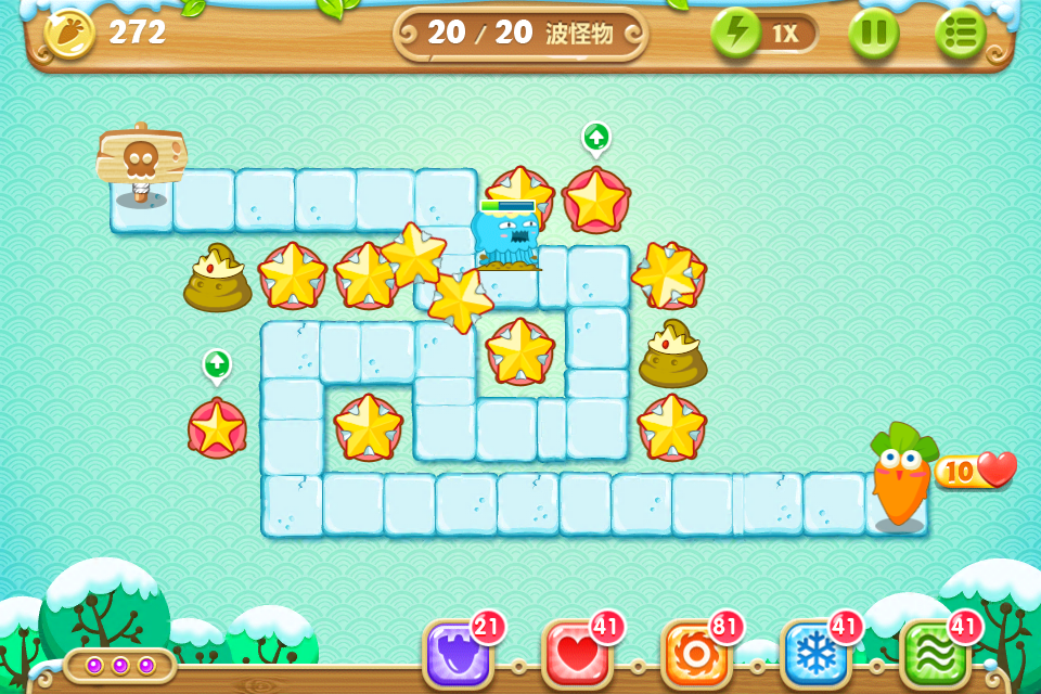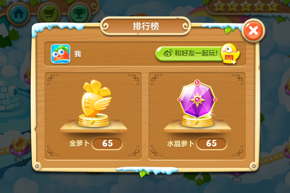 目标:不用魔法攻击,不用带技能的萝卜,全部65关收集金萝卜、水晶萝卜、全灭道具过关