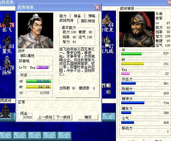 每关战前我都会在练武场把所有人都练到平均等级,因为有轩辕春秋在练武场赚功勋也很快。九成62级加入,开敌方成长加入的时候统89智102,进3次练武场练到平均等级64级,统帅到90还有130+的功勋多(其实他的统帅升不升档关系不大),汤怀68级94%经验,武统智敏都已经提档运气104。出场人物飞帅67,银瓶64,牛皋64,杨虎64,施全64,九成64,汤怀68,敌方金兀术69,小兵65。