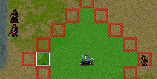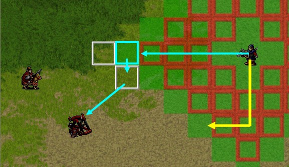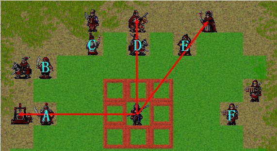 到这里还没结束!上面说过,AI是朝离自己最近的“人”移动,而不是最近的“攻击位”移动。该图中,AI在A框里能攻击到的只有一个敌人,所以最终目标锁定为这个人,然后朝着此人(或者说此人所在的位置)移动。