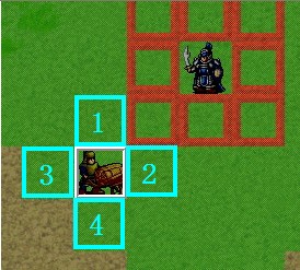 下图中,AI到1234四个格子消耗移动力都相等,1号和3号两个格子靠上,1号比3号靠左,所以AI会选择1号,最终去左边攻击郭嘉。