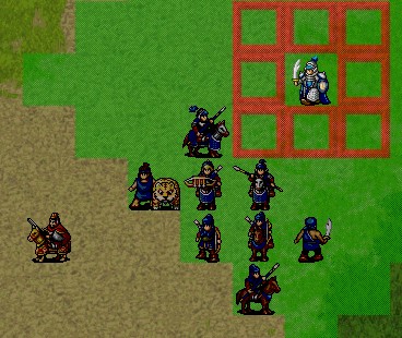 在白框中吕布可以攻击到多个人,根据规律四,AI会选择出场顺序靠后的人。通过查剧本可知,白框右下方那个弓兵的出场顺序比他上面的两个步兵要靠后,所以吕布的目标锁定为这个弓兵,他要朝着弓兵的这个位置移动。但是,所有可以移动到这个弓兵的路线全被堵了(弓兵的上下左右四格都被敌人或者障碍物占据),所以吕布只好不动了。下图中把吕布的移动力修改到255,可以看得更直观。