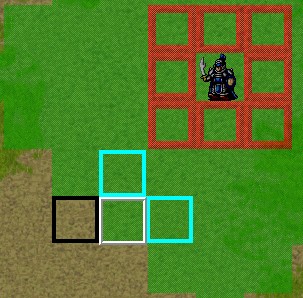 下图,当我军进攻到一定程度,打通吕布通往弓兵的道路时,吕布就会朝着弓兵移动,选择移动力消耗最少的一条路线,按照上右下左的顺序走到图中的白框位置。
