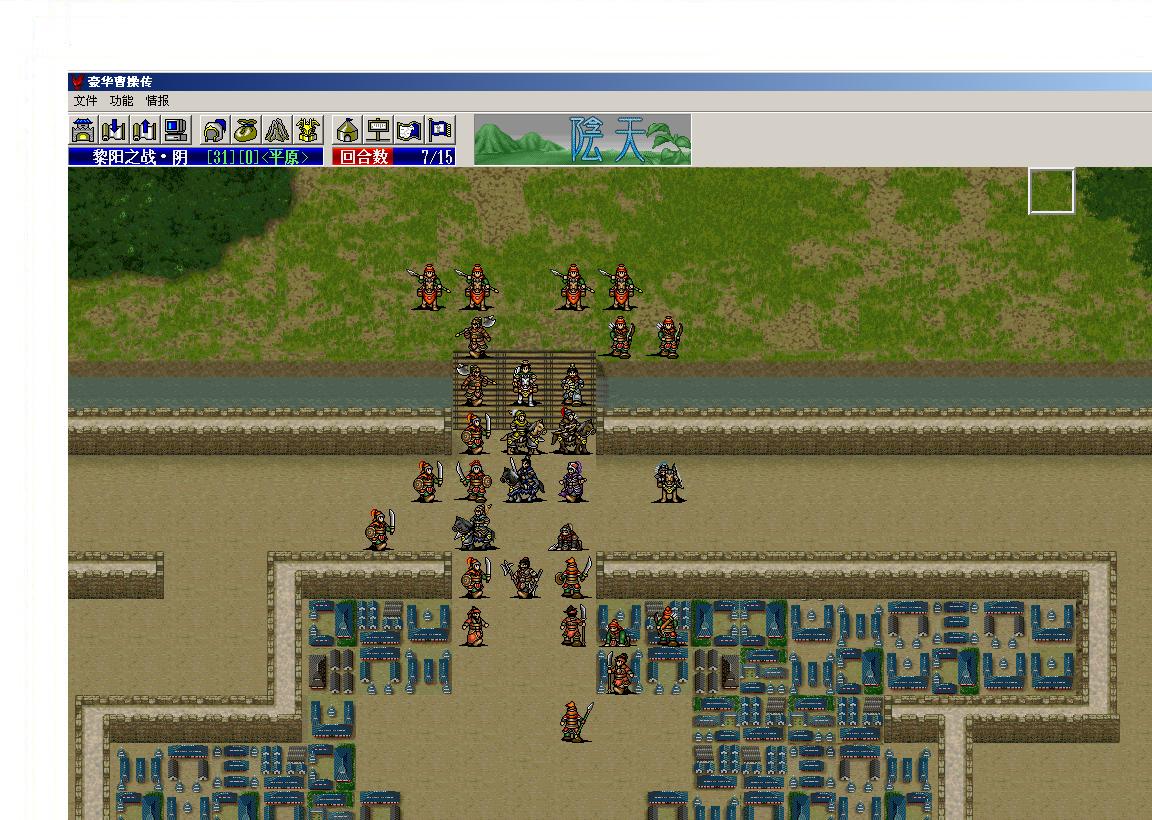 第一回合,夏候渊斜向击退中间步兵一格,乐进向前进城攻右边的步兵,曹操接攻,夏候敦再攻并突进,然后,张辽和典韦再攻消灭右边的步兵(需要读档开局出连击或爆击),李典往右走并强行。第二回合李典再强行(多加移动)到内城的东门,郭图会对他放毒。这样他就会晚两个回合消失。李典3、4回合能干掉医师并引两三个兵过来。第五回合连击或攻击后就能进东门的鹿岩,第6回合再强行往南边的鹿岩行进,第7回合连击后就能进南边的鹿岩。以后就守着连击,或者移动攻击刀兵后退回鹿岩(这样每回合有16MP,保证连击)。