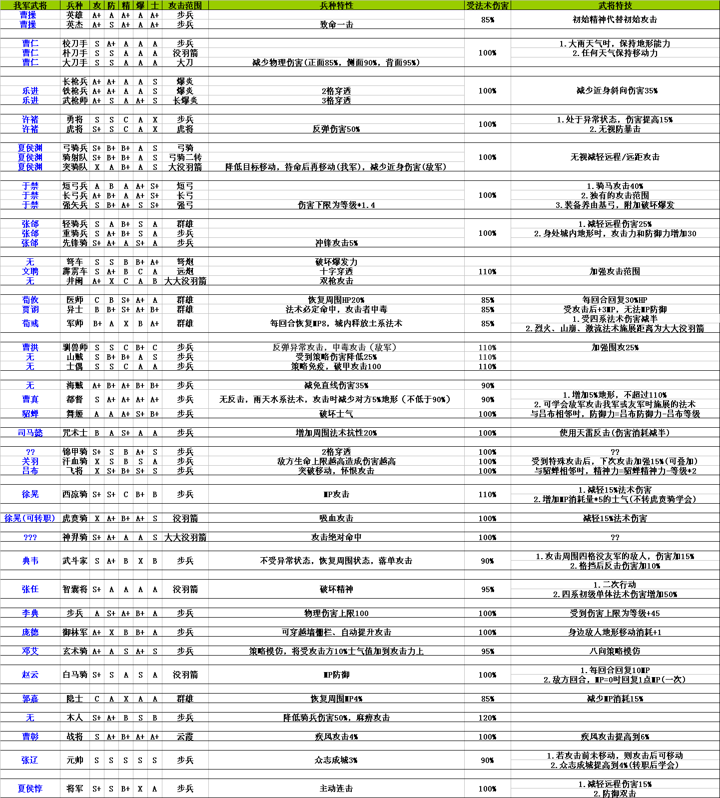 10月1日:增加了受到法术伤害的百分比,更新了部分武将的特技和学习条件,增加了几个兵种的特性(新发现的),未出现的武将依然以?代替,更正了原表几处错误