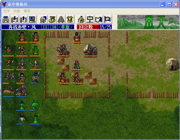 刚开始玩赤壁2这关的时候各种被虐待,各种加速就是合不了兵,蹲两边墙角老是被潘璋击退,破坏阵型,各种减员。后来仔细观察了地形,发现左边可以突破到岸上去,吴军水上全是地形100以上,左边岸上有平原、树林、栅栏,开始搞起,因为达到建业之战了,前面的没截图,就15关的截图,和大家一起探索,因为18回合敌军就撤退了,全灭很难