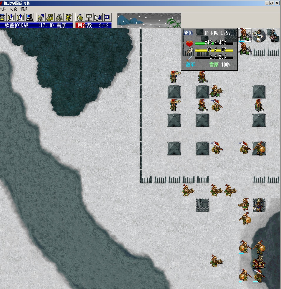 第一回合,张九成走到金术右下,汤怀走到张九成右边不要攻击敌人(因为我开了必杀,一回合清不掉,敌人会秒掉张九成,所以选不攻击)