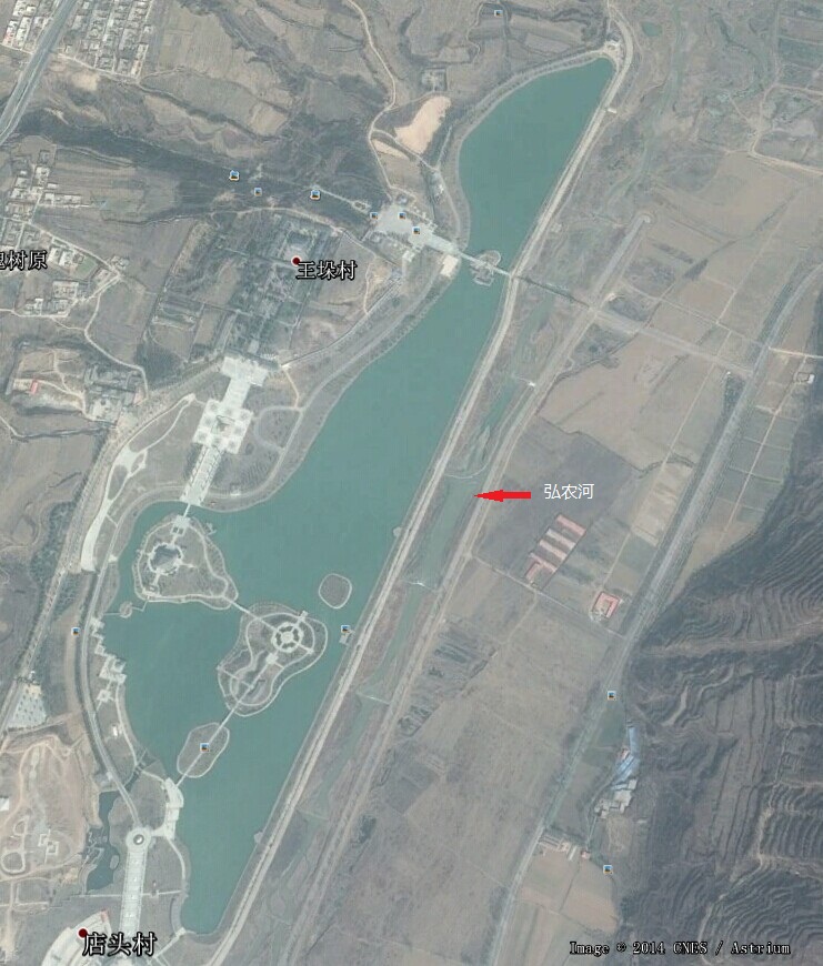 这是谷歌地图上的函谷遗迹,那条纵贯东西的大沟就是当年函谷,王垛村所在就是当年的函谷关。