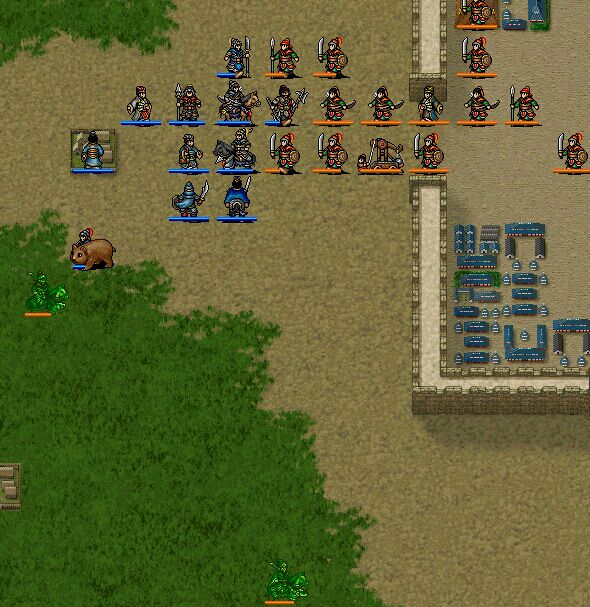 第一回合孙坚后撤,集体往前走一点,小夏侯走到袁绍前面步兵的斜下方把敌人的一个步兵勾引过来砍他(还有个弓兵也会过来射他)敌军阶段黄盖程普撤退。