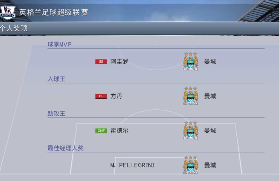 开赛抢了佩兰的饭碗,随手逼平曼城,点球胜之,拿了本赛季第一个冠军。欧洲足球先生被那不勒斯的雷东多获得。