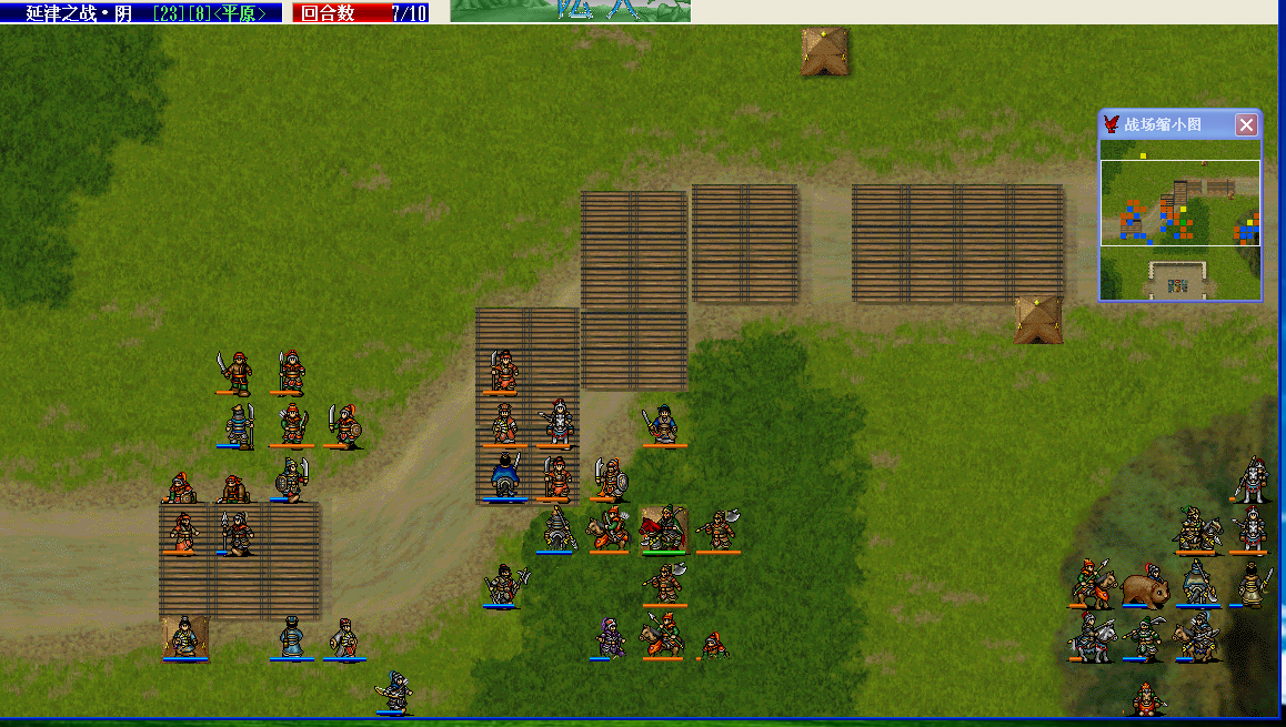 于禁过去把绝影给乐进,曹操过去给乐进加血,典韦上一步收掉残血小兵,乐进走到典韦左上换来推推然后上移准备干张贾二人。李通往曹操这边靠卡位输出。徐晃去打弓骑兵。郭嘉给李典加血,李典打弓兵,曹洪夏侯渊输出步兵。见第八回合: