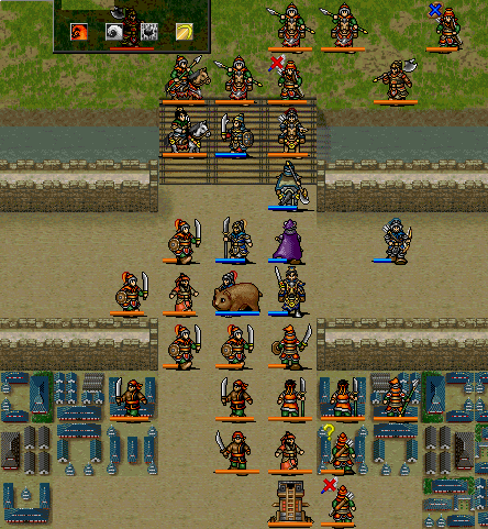 上路弓兵被郭图加过好多次血了,不要紧,实在不行后面李典出城一刀一个,给他们加血总比给步兵加血强,这关比较特殊,弓兵是能被反击的。徐晃曹洪收掉那个武术家,曹操往下走一步撑大圈子。