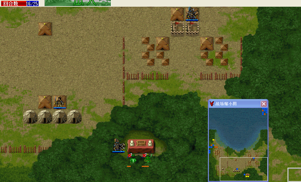 上路于禁尽量远走,因为这回合敌军输出太猛,等这回合之后反击一番弓兵降了敏压力就小点了,顺手射一个贼兵,禁魔一个是一个。其他人布好阵,留一个缺口,可以吸引来一个弓兵。见下回合开始图。