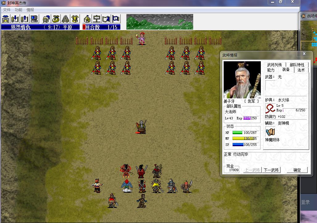 随便什么人给木吒吃“虎骨”加攻击力buff(木吒前期我没练好,现在只能这么干了),调整功勋加统帅,走到(9,16)给姜子牙补满血