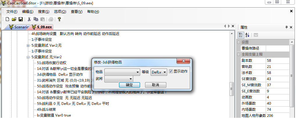 我用VAN太守的剧本编辑器打开曹操传原版的S剧本,想修改一下宝物的获得,比如把献帝出逃战的黄金铠改为凤凰羽衣。