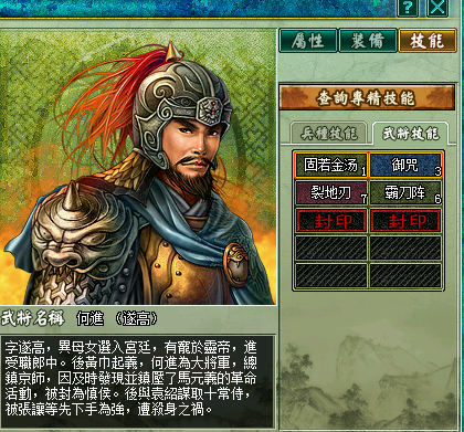 按说我军已经有简雍糜竺两个医生,可两个大叔怎么比得上美女太后呢,医生是不可缺少的兵种,像何太后这种既养眼又实用的队员,自然是多多益善。买不起华佗和张医生的玩家有福了 。何太后的四个天赋技能为无惧、真御咒、剧毒、捆仙风(有说她带仁心的,反正我没见过)。对医生而言,攻击技能没什么用,个人觉得捆仙有没有无所谓,留着位置打书比较好。