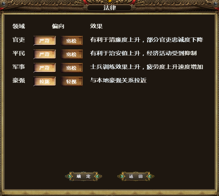 官吏:选择严苛提高清廉度,但会随机降低部分武将忠诚度。如果选择严苛发现违法官员默认问斩或免官