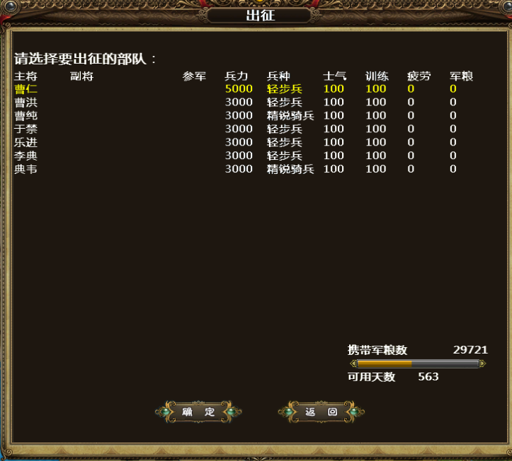 部队每次出征需要配备粮草,粮草不足需要回到城池(关、渡口)和营寨才能补充,有剩余粮草返回城池(关、渡口)或营寨不会自动卸下粮草