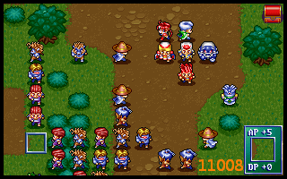 上边魔导耗光及亚克魔补后,闲人捡右边箱子和门口左边暗箱(力量药水),盖亚继续清敌(早先怕不够杀,布兰多往上送,结果有富余,裘娜清掉)。19回合我方站位及高级援军出现后形成下图10020,其中盖亚上一为低级骑兵。