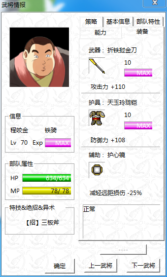 2、六军镜形势和破甲剑给师姐以便定点清除某些位置的敌人。我方回合保证504点输出,足以秒杀箭车、锤骑以外的普通小兵。