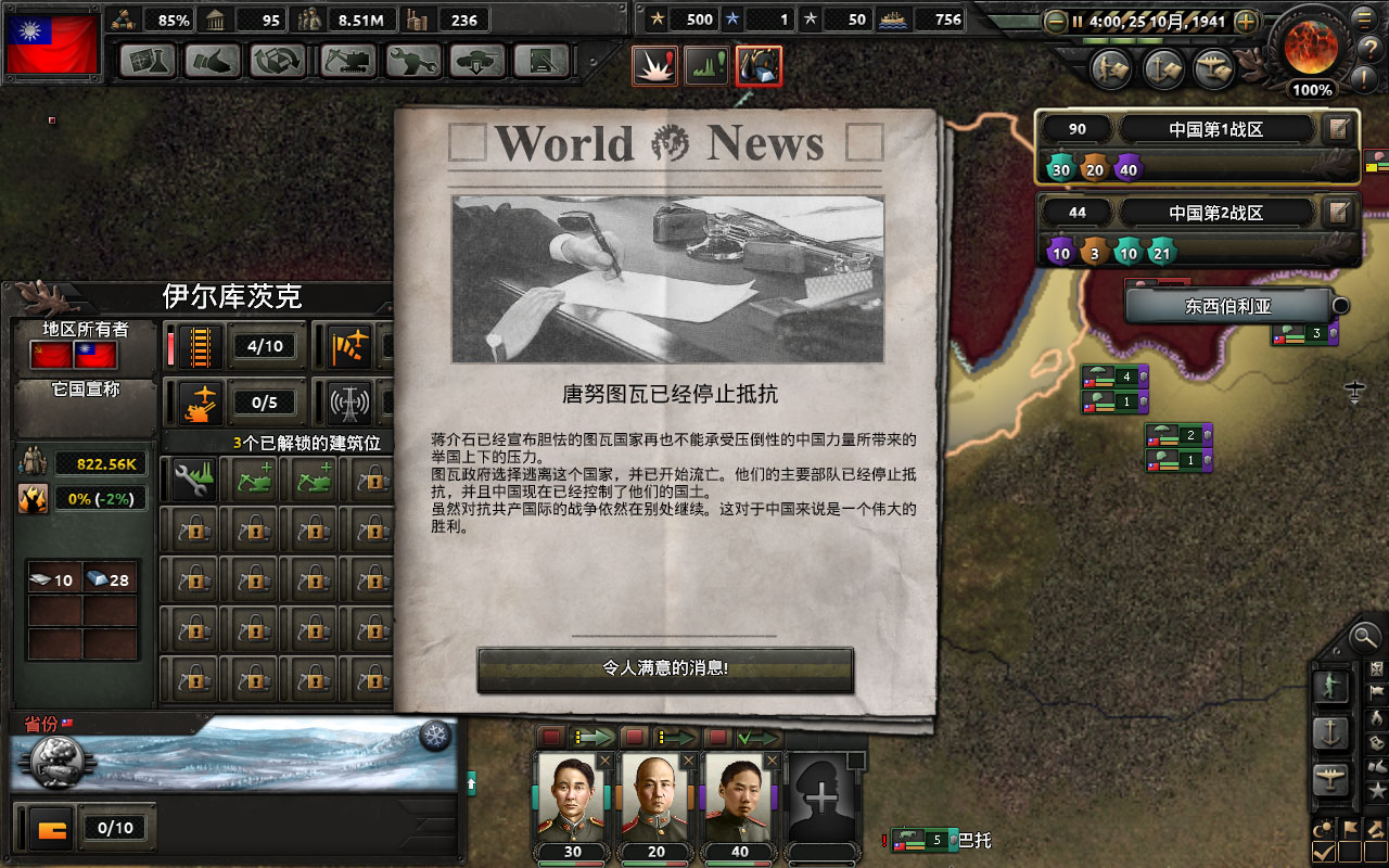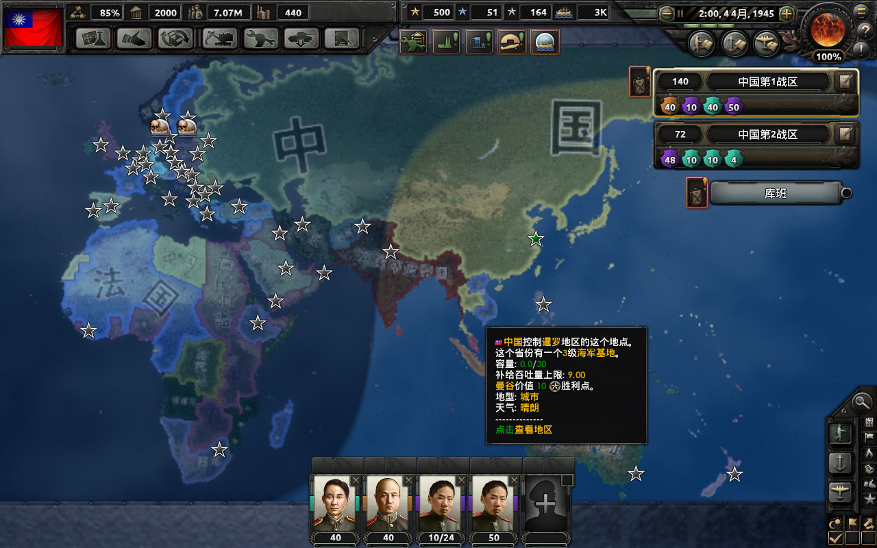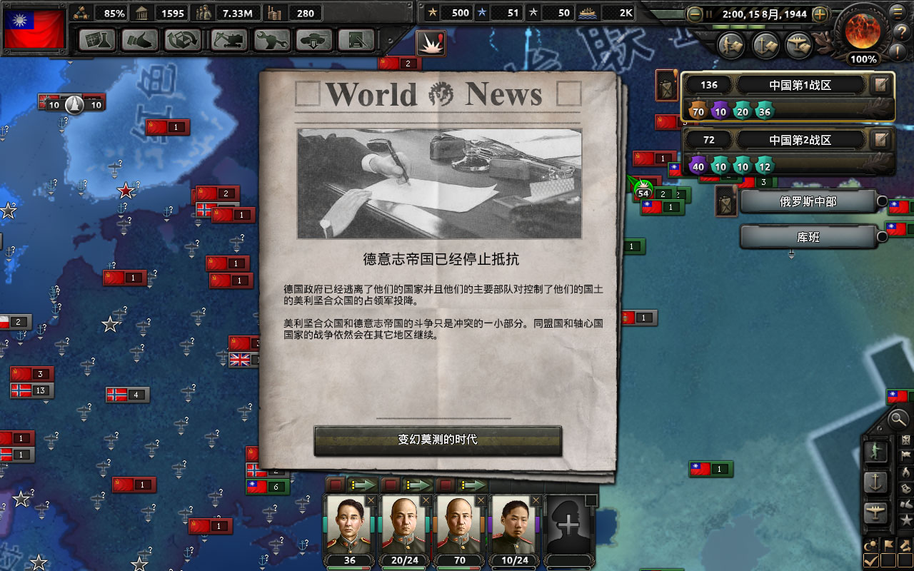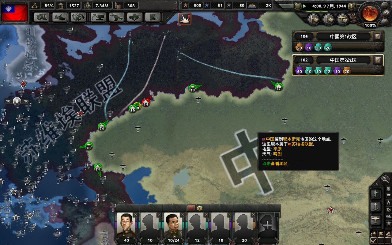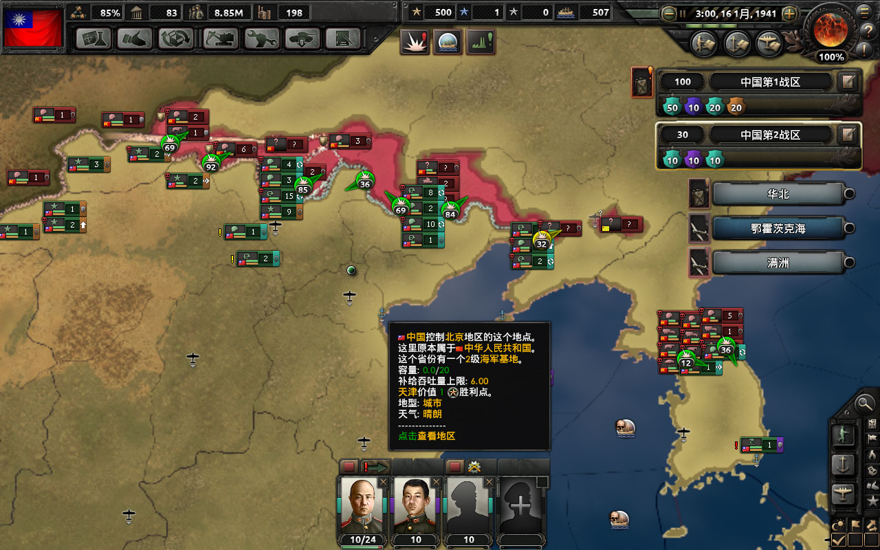 国军总共110个师,守备师10个,伞兵师10个.5步4炮王牌步兵师30个.刚扩编过的14步3炮3反坦大编制步兵师10个.7步2炮标准步兵师50个