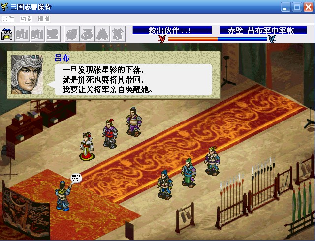 魏延终于找到吕布,并说明张菁被俘的事,吕布立即招集将领组成救援队救出张菁(59关),并在过程中意外遇到受控制的张氏(星彩)、赵公明的殿军与复活的关平,但赵公明却暗示吕布如何用自身之力让他们摆脱控制........