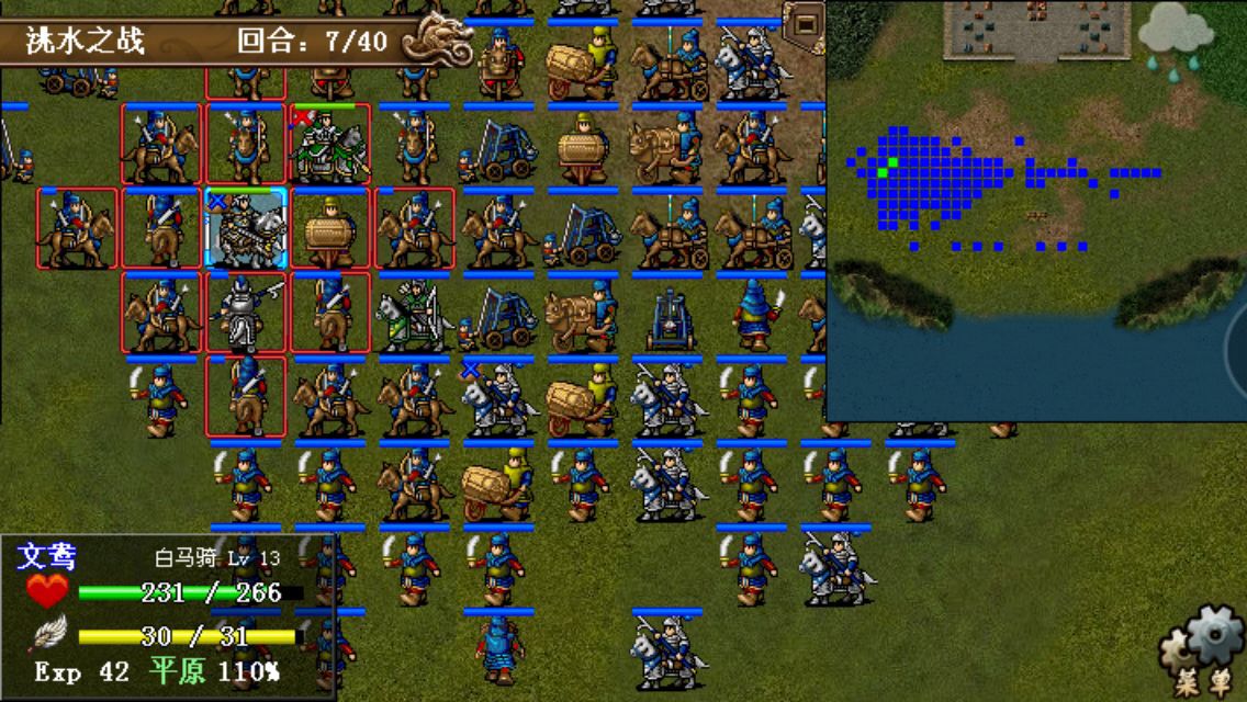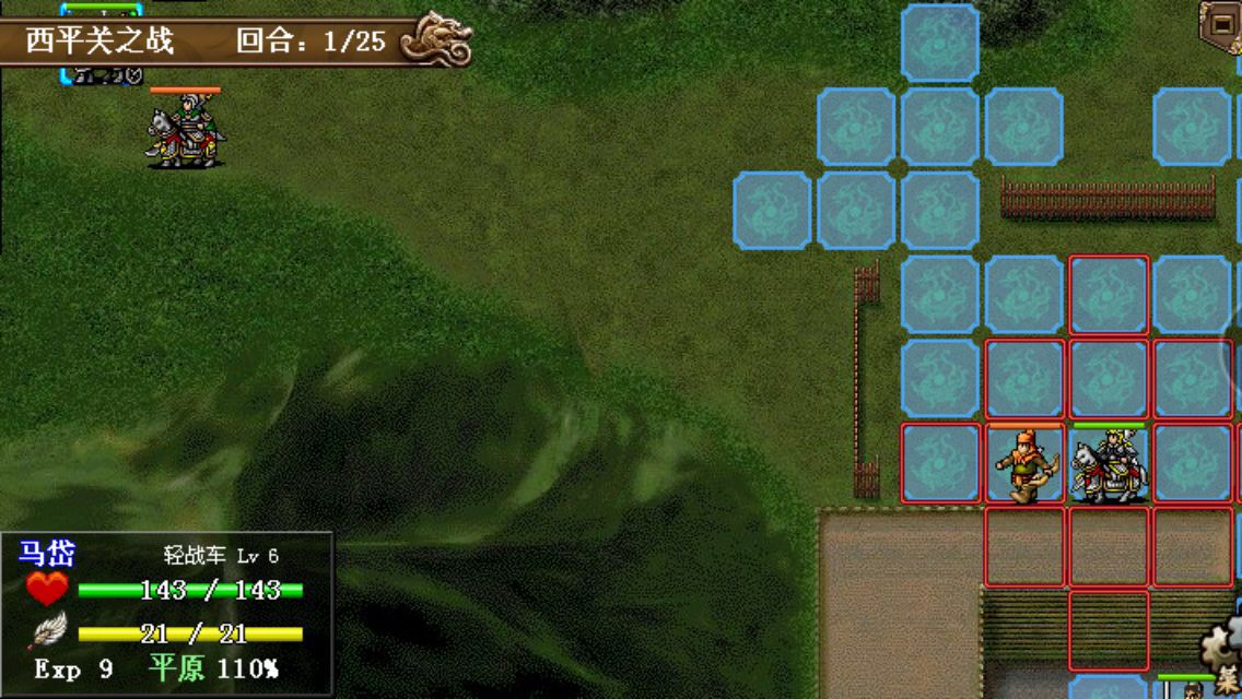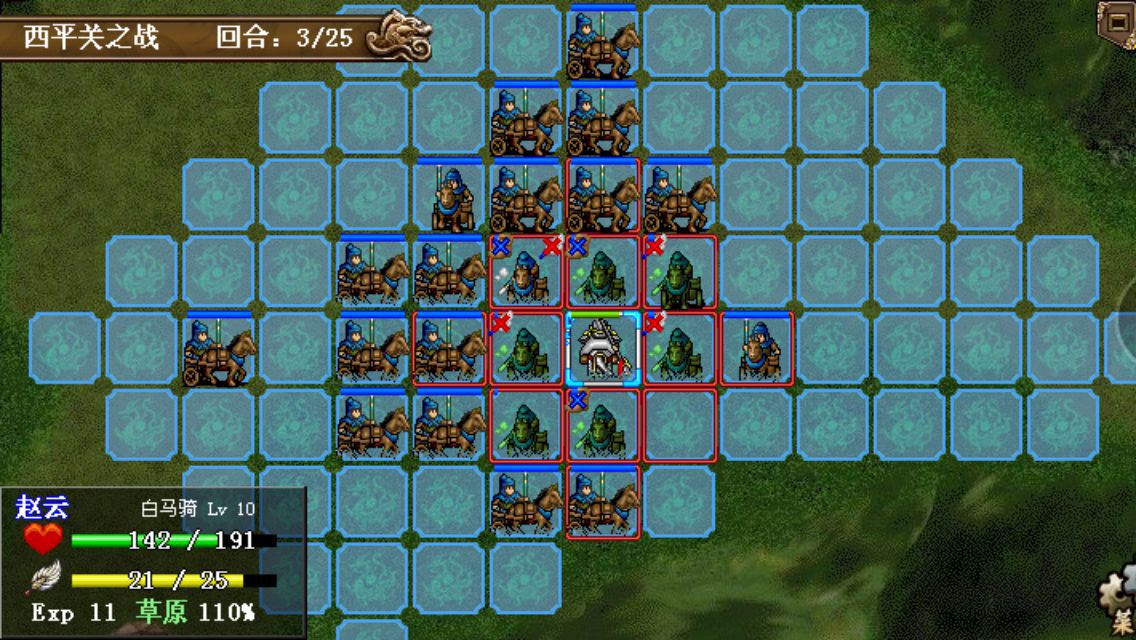 本关比较简单,赵云一人即可杀光所有人。左边张苞马岱一直后撤,赵云加攻加防后,直接打马上前,一人枪挑所有西凉战车队,二回合反击即全部杀光,来多少杀多少,7回合杀光所有小兵。