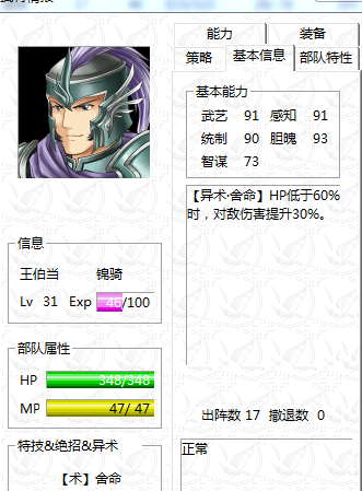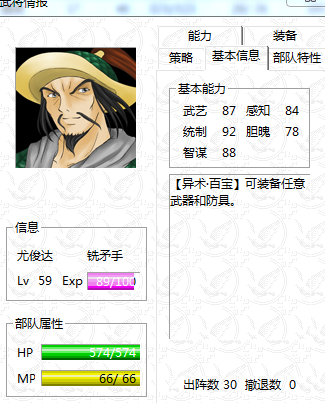 大家关心的雄狮伍登,平级的,有几个托等级比较严重,所以,伍登收进来59级,数据一般,比较平衡的兵种,第一关还是山水战,雄狮的地形适应比较差,移动也差,没有发挥空间,带着虎类豹,效果还行,给周围尉迟、姜松加士气,加大特技的几率