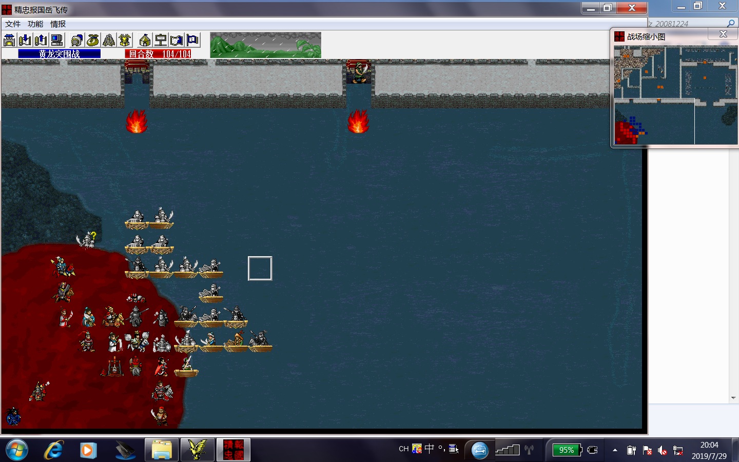 右路: 吉青原地双击(其中一暴击)灭兵营和城池中步兵加下方一驼龙左侧一鱼鳞; 岳飞进城双击灭上方弓兵; 高宠进兵营给张宪喂药; 杨继周右一下一攻骑兵并灭一鱼鳞, 岳云下五灭骑兵; 诸葛锦下四水淹张宪左二驼龙, 张宪左一上一灭之; 岳银瓶下六左一灭左侧驼龙(注意不要被反击打中而麻痹, 否则就要希望下一回合开始自动恢复); 张九城下四回归杨继周, 杨继周下一左三攻两鱼鳞.