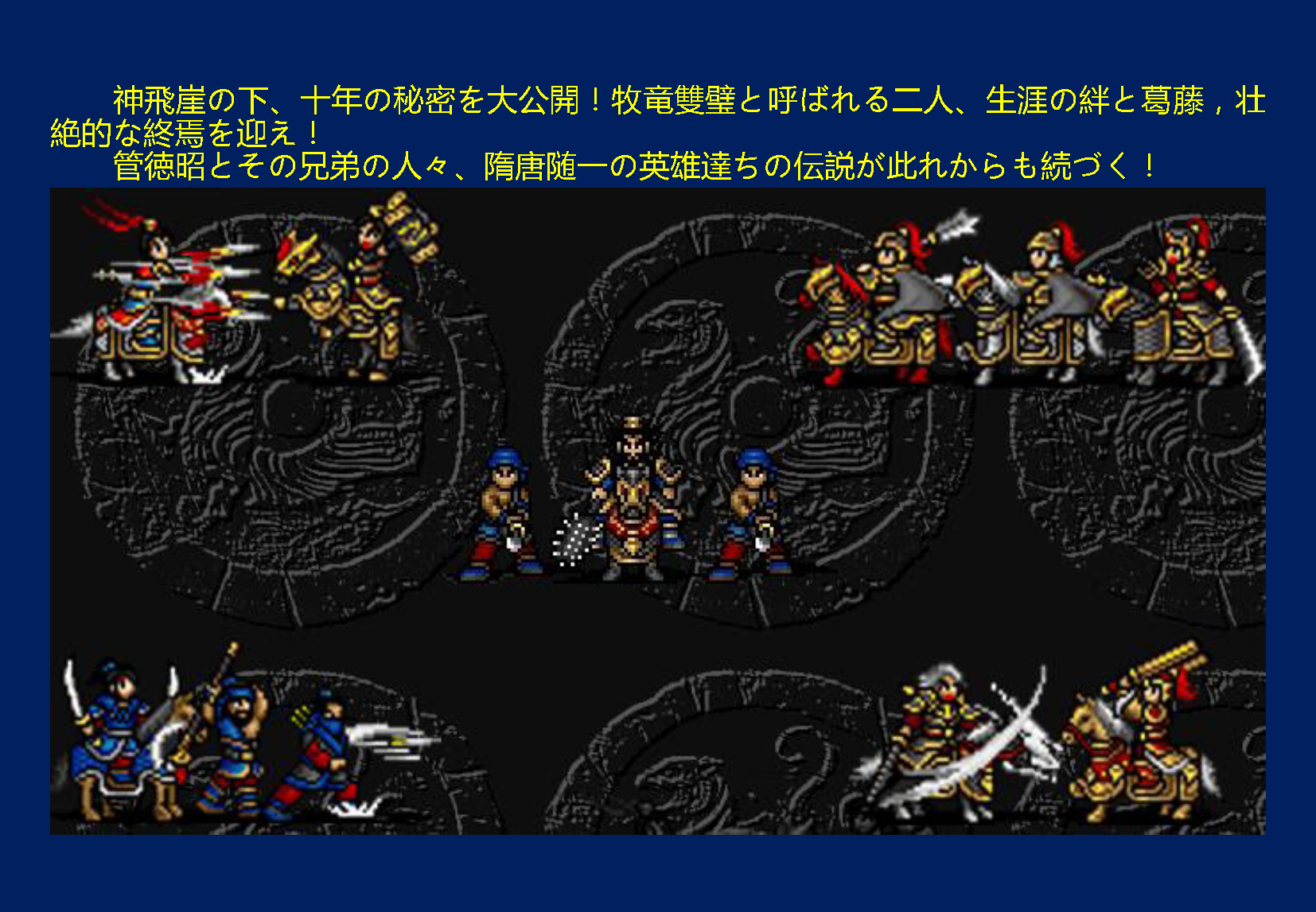 别问为什么是日文,低成本平面静态预告一要有气势,二要兼顾不剧透,看个大概明白也就OK。总之大家一直翘首以盼的苏罗决战如期而至,纵横前三章风光无极限的小罗成终于也微笑着走向了热气腾腾的饭盒(陪他一起先后离开的瓦岗兄弟还有另外两位,在那个世界也要健康幸福!);赤练魔经之谜彻底被揭开,神飞崖下,历时十年的恩怨情仇一朝了断(此前一直为苏师妹守身如玉的玩家将获得巨大福利!);而随着天下一统的日程将近,作为大唐开国功臣的瓦岗群雄,也将接受来自命运更加残酷的涤荡和冲击!