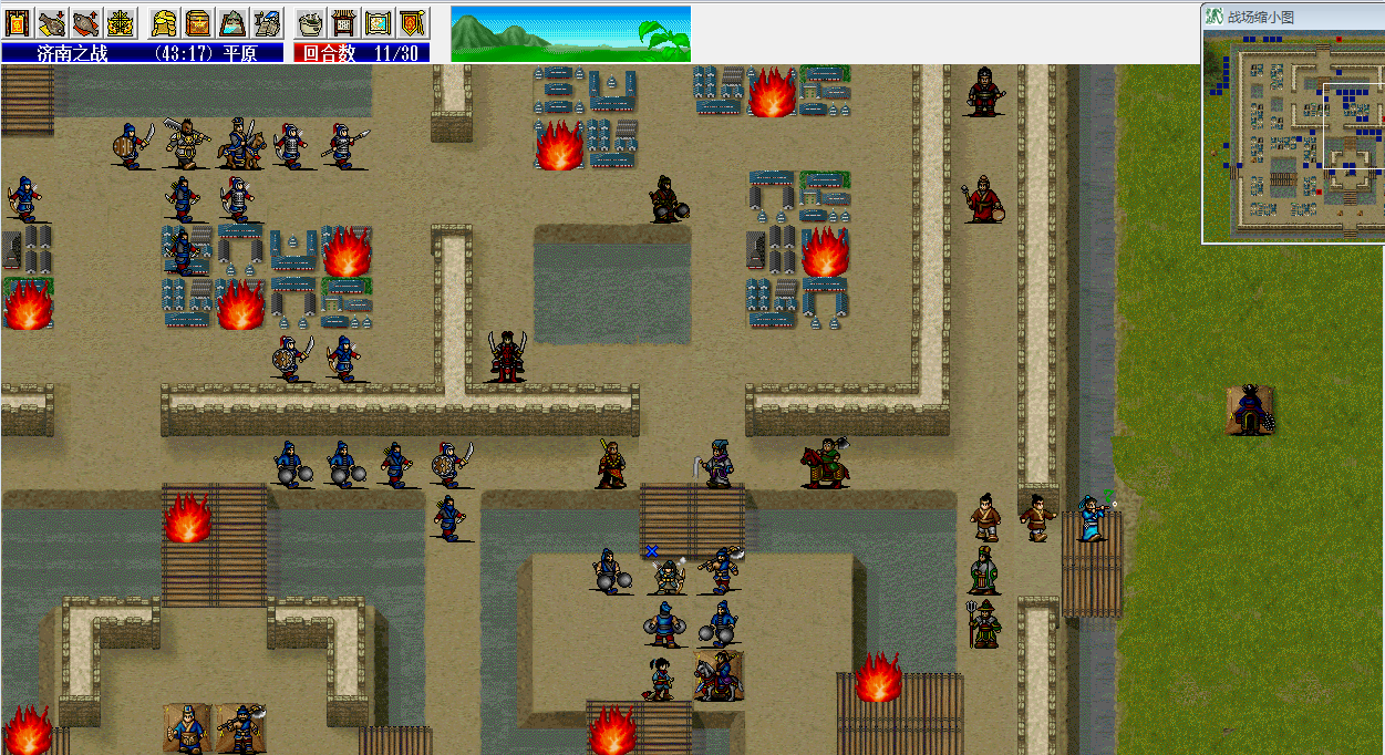 c.击杀苏凤后,老单、管毅、魏征和小柳的站位参考第9回合,这样的话,高明高亮兄弟就不会烧到百姓(给百姓加血很费补给),只会烧管毅、老单或小柳;如果运气好,第7回合开始能SL出雨天(几率很低),那再好不过,徐世芳出现后对老齐的策略伤害也会降低很多(毕竟毒有一定几率不掉血)。