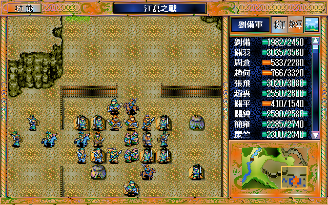 我 周仓左上攻击消灭弓兵1,关平右上激励刘辟,糜竺右激励、赵云左上援助关平,赵何下一,关纯右下、简雍左援助赵何,关羽左下牵制徐晃(失败),刘备右二上二激励自己;