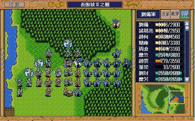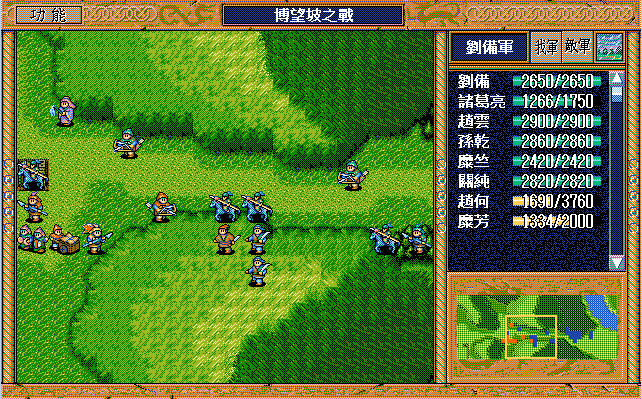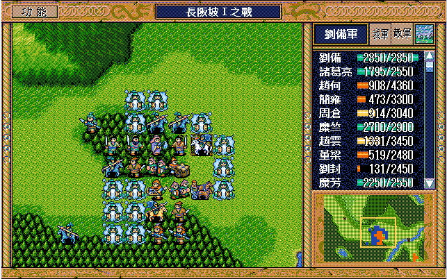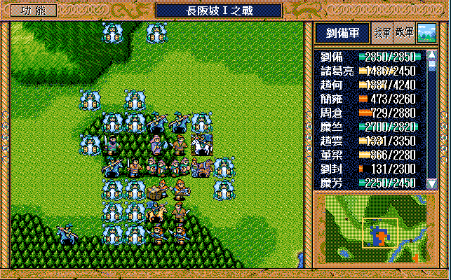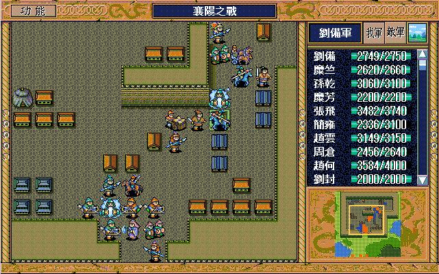敌 李典左下攻击赵何(明显攻击糜竺或董梁的行动价值更高,却只攻击赵何,可能和刘备的位置有关),夏侯惇左攻击董梁(反击),夏侯渊左攻击赵何,张郃左攻击简雍,曹洪左援助夏侯渊,贼兵3左上攻击诸葛亮(明明在原地山上就可以攻击,非要左移一格,而且刘备和他还紧挨着,真不失漂移本色)。
