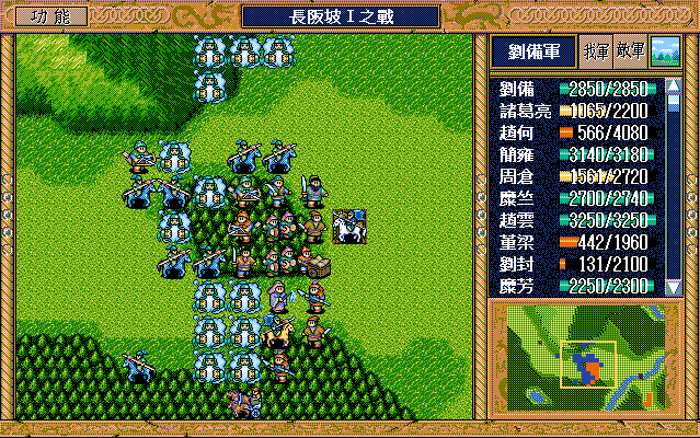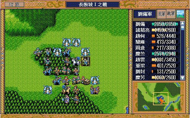 敌 夏侯渊左攻击刘封,乐进左攻击董梁(不反击),张辽左上火龙、夏侯杰左上上猛火周仓(都失败),焦触左方两格浊流刘封(兵力130左右,士气54,长坂坡II之前不再援助、激励他,一是方便长坂坡II开始时的就业,二是士气低了有利于后面群殴曹操),曹洪左方两格火龙董梁(失败),文聘左攻击周仓(三回合),骑兵3左下牵制(难,不用挑拨是为了留下他仅剩一次的策略机会,下回合牵制我方以提供军乐队就业)、骑兵5左方两格挑拨赵云,骑兵6左方两格挑拨周仓(二回合),弓兵1左下援助文聘(二回合)。