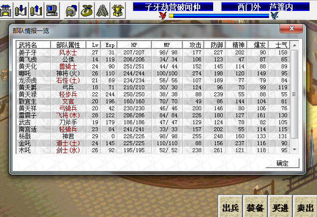 这关由于装备等级,走位等问题,攻略只有参考价值,人物太多,走位很难控制的,需要自己根据情况调整(不像第二关,可以控制敌我双方走位,救友军就靠这个),开始决定墙的人选,有主墙和副墙,还有选择负责吸收伤害的人员,就是一回合挡位,下回合必须跑的人。这个没法详细说,只是一个打法,具体情况只能自己根据战况临时决定,开始的时候可以利用哪吒,反击伤害比较高,计算张节的走位(是这个吧,放连环斩移动很快的那个),故意进入他的最大攻击范围,可以通过反击一下把他打残,这个是唯一大家都能做的,也是能具体到细节的打法,其他的说了,其他玩家也不一定能做到,这关只能介绍下人物职能,具体打法说了没用,墙的人选,哪吒(浑天,乾坤圈没所谓,打哪吒的怪不多,用周易练装备更划算)天化(除了狐裘,那件防高穿那件),雷震子(狐裘,感觉4人中雷震子最吸仇恨,本人狐裘7级,防御最高,还带回血,给他了,带狐裘的雷震子最能扛,步兵基本打他,3个步兵加财神爷三下,有防御状态,全中都死不了),天禄(带专用甲,可以自动加防),副墙杨戬(带水合本来想刷狗出来多个人用,结果根本刷不够SP)和南宫(合扇,MP甲),杨戬上面,上面怪比较多,需要杨戬帮忙回复,站位是雷震子,隔一格哪吒,同一竖线,天化站哪吒斜下,天禄和天化并排同一竖线,杨戬的位置是雷震子斜上,不要一开始就站过去,等怪走到雷震子上面打他了,才过去,天化主要降攻防,例如,有名字的怪,这回会过不来,下回合能过来攻击,优先降攻,那个怪需要优先杀掉,降防,间隔里的怪优先杀,天祥和姜子牙(带封神回自己血,他的主要作用还是回别人的血,必要时候挡位,能自己回血减轻治疗压力)打正面的怪,不要打斜线,斜线位置对于姜子牙有点危险,木吒和南宫在下面,打落单的怪,需要的时候南宫可以当墙,木吒就不要了,他一进入多个怪的攻击范围,会被集火,一般是杀走到天禄下方的怪,在天禄身后打,打完看情况需不需要南宫补墙位,天爵喂药,人员太密集了,基本没出手机会,打斜线那是送死,龙须虎和飞虎没出,一个没伤害,一个等级太低,,,金吒,龙虎兄弟站散宜生周围,同时需要能被那个放(群水还是群风?忘了)魔法的怪能群到,散宜生必须被攻击到,不然不会过来,扛过这两群怪,后面的没难度了,不是主动出击的怪,引着杀没难度,散宜生的血量和防御必须能扛住财神爷一下攻击加一下魔法伤害(等级不够去练武场升级,升到顶了还不够,吃加灵力药,如果还扛不住,那只能自己换打法了),防御不能加,怕去打毒龙,这个更扛不住,血太少,开始配装的时候,毒龙的防御必须比散宜生高,让散宜生作为财神爷的第一攻击目标,这里本人出的是米衣,没得选了,剩下的高防装这件最高。。。。剩下的商店货,那件最高穿那件(这里本人失误了,这关可以买2级装备了???没看见,虽然本人近视挺厉害,难道瞎到这种程度?每关开始前都会打开商店看一眼的,不会看错了那么多次吧。。。现在打完34关,打34关天化穿的还是3级大红袍,打的时候还在骂攻略坑爹,我把6级大红袍之前给姬发了,3级大红袍天化扛怪有点危险。。。。当时还在想,友军都带2级装了,怎么商店还没开卖??结果写这篇东西的时候才知道,原来早就有了。。。。),大概就这样了,最后需要注意的是怪会群降攻降防,如果导致你减员或者下回合开始杀不了目标怪,SL吧,这个没办法。反正影响不大就不SL。