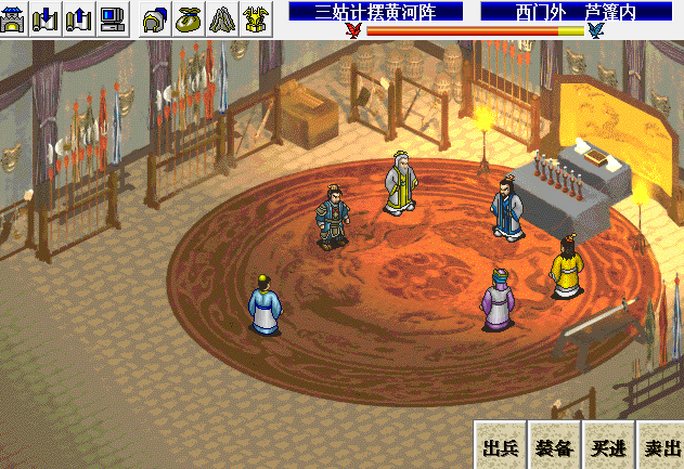 第六关,开战前御装备,为下关准备,南宫裸奔,石怪引不上去的,友军肯定主动上去攻击怪把石怪引下来,攻略在次坑人,可以利用南宫和散宜生吸引石怪攻击集气,其他人堵门慢慢杀吧,堵门注意走位,一开始可以姜子牙和姬昌堵门,堵下两格,接着换友军步兵堵门,友军单挑通过控制怪的血量引诱友军走位很容易触发,小心南宫的走位,被两个石怪打有点危险,上面崇黑虎随便,把怪清完必杀肯定早就放出来了,最后姬昌把装备给南宫,南宫放必杀可以降BOSS防御,不降防杀不了BOSS,当然你也可以直接对话过关。不要小看南宫,没了弓手和石怪,裸奔的南宫完全可以上场打步兵的,水里可能不行,荒地上没什么问题,本人打到后面南宫集了两管气,两个必杀配合其他人,直接杀BOSS过关。