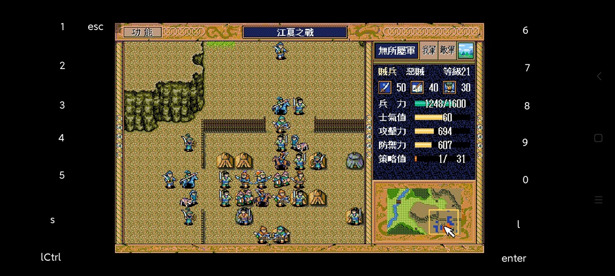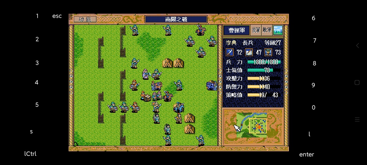 30回合初图,本关策略充足,刘备都可以全策略只是调随机数有几回合没行动,变阵的时候可以给敌贼补策略援助。但是也补不了几次,前面10反击点忙着补血,变阵会有人会补不到贼,后面好多敌兵都40士气以下,激励优先级很高,补了策略也是激励。