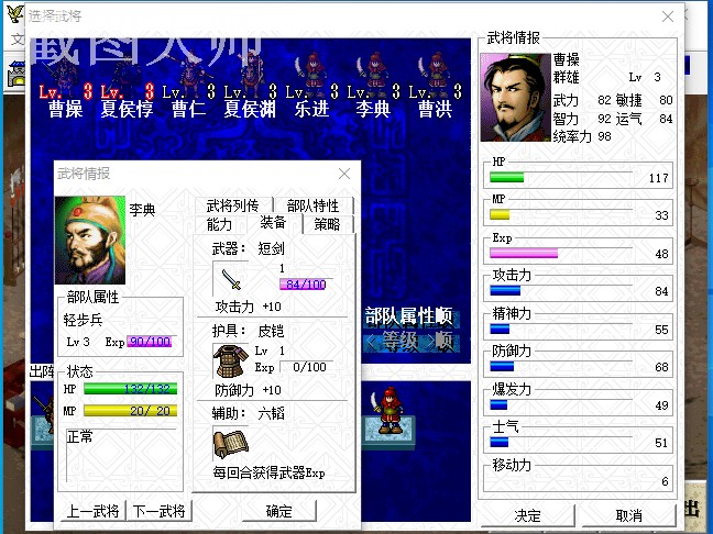 曹操91(8)夏侯惇43(27)曹仁67(54)夏侯渊69/MP10(18)乐进121(3)李典117(3) 曹洪153(3)