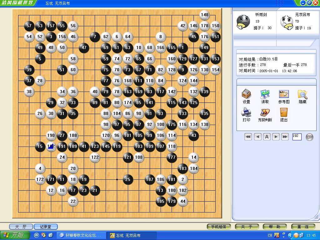 桂阳赵范的实力不错,居然吃了偶一块。 不过白转换吃掉黑角后,至192已成胜势。最后白胜33.5目。