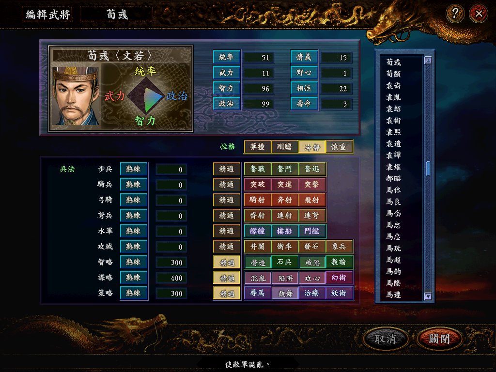 最后说说三九里的文若,统率51,本来他是百官之首而且战略眼光深远应该加点只是他缺乏实际战斗和独当一面的表现.武力11.一般文官都是这个水平,智力96,谋士分为战术,战略两类,前者的代表有陈宫,法正,程昱,荀攸,后者代表是奉孝,孔明,文若缺少实战和个别战斗但他的整体意识强,眼光高,差不多了,政治99,这个没的说,外交,后勤,驻守,内政,谏议都极佳.兵法上来看有鼓舞,攻心,破相,混乱,陷阱,营造,智略,谋略,策略三个精通.义理方面是最高的15,他的统率低下不适合做城里的大将,再加上武力极低,战斗类兵法都没有所以也不适合于做主将出征或输送,但是他为人冷静,精于智谋,可靠稳重,所以他适合于随军出征帮助吕布之类的大老粗来预防陷阱,破解伪报,鼓舞士气,施展计谋等等,很容易那三个精通的就达到1000的熟练度,另外多次出战后将攻城和船只学会就可以放心的让他充当一只部队的军魂,至于发展内政,登庸人才,施展外交,离间敌人,搜索宝物都是最佳人选,智力虽然只有96但是只要给他本书或是去祭祀两次就是一个出言必中的好军师.或者让他做都督内政提升是非常非常快的,只是野心和统率不高让他实行功略城市时比较困难.最后说一下他的计谋发动概率和威力都是非常大的丝毫不逊于诸葛等人。